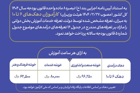 به گزارش روابط عمومی سازمان آموزش فنی‌وحرفه‌ای کشور با مصوب شدن آیین‌نامه اجرایی بند (خ) تبصره ۸ ماده واحده قانون بودجه سال ۱۴۰۴ کل کشور توسط هیئت وزیران در ۱۴۰۴/۲/۲۷، تعرفه جدید خدمات آموزشی به میزان مشخص شده در این قانون از پنج دهک بالا اخذ خواهد شد.