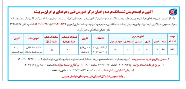 اداره کل آموزش فنی وحرفه ای خراسان جنوبی در نظر دارد ششدانگ عرصه و اعیان مرکز آموزش فنی وحرفه ای برادران سربیشه را از طریق سامانه تدارکات الکترونیکی دولت (ستاد)  و مزایده عمومی به بالاترین قیمت پیشنهادی به فروش برساند. لذا متقاضیان محترم جهت بازدید در ساعت اداری از مورخ  29/09/1404لغایت21/10/ 1404 با شماره تلفن 32258527 دفتر حقوقی هماهنگی به عمل آورند.