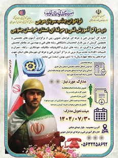 اداره کل آموزش فنی و حرفه ای خراسان جنوبی، پس از برگزاری آزمون های تخصصی و همچنین گزینش از بین فارغ التحصیلان دانشگاهی رشته های فنی و مهندسی در مقاطع تحصیلی فوق لیسانس و دکتری، در رشته های (برق و الکترونیک، مکانیک، جوشکاری ، رایانه ، عمران و تاسیسات ) اقدام به جذب سرباز مربی در مراکز آموزش فنی و حرفه ای شهرستان های استان جهت اعزام های سه ماهه چهارم سال1404 (دی، بهمن، اسفند) می نمایند.