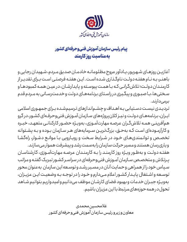 هفته دولت و بهطور ویژه روز کارمند را به کارمندان عرصه مهارتآموزی، کارشناسان پرتلاش و متخصص سازمان آموزش فنیوحرفهای در سراسر کشور تبریک گفته و مراتب سپاس خود را از همراهی و حمایت آنان در مسیر رشد و توسعه این سازمان بهعنوان محور توسعه و اشتغال پایدار کشور اعلام میدارم و خود را در توجه به وضعیت این عزیزان، بهویژه جبران خدمات و بهبود فضای کارشان موظف میدانیم و امیدواریم بتوانیم شاهد تحول در همه حوزههای مرتبط با این عزیزان باشیم.