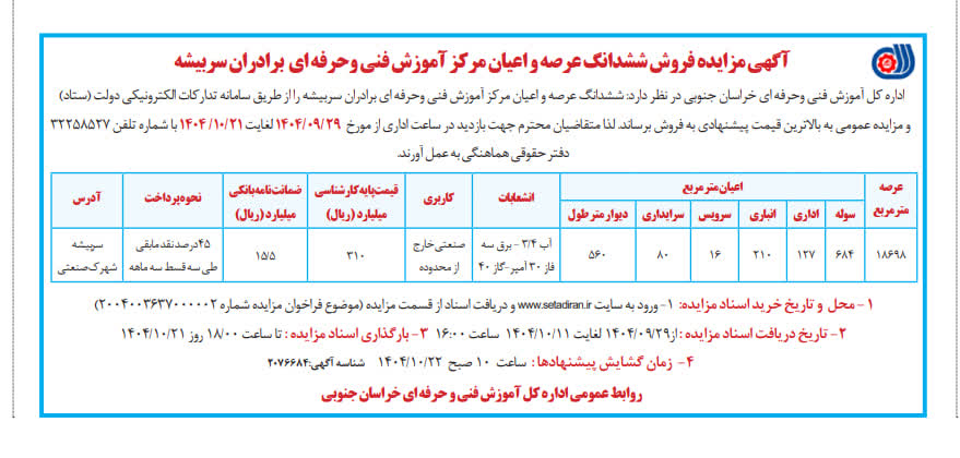 اداره کل آموزش فنی وحرفه ای خراسان جنوبی در نظر دارد ششدانگ عرصه و اعیان مرکز آموزش فنی وحرفه ای برادران سربیشه را از طریق سامانه تدارکات الکترونیکی دولت (ستاد)  و مزایده عمومی به بالاترین قیمت پیشنهادی به فروش برساند. لذا متقاضیان محترم جهت بازدید در ساعت اداری از مورخ  29/09/1404لغایت21/10/ 1404 با شماره تلفن 32258527 دفتر حقوقی هماهنگی به عمل آورند.